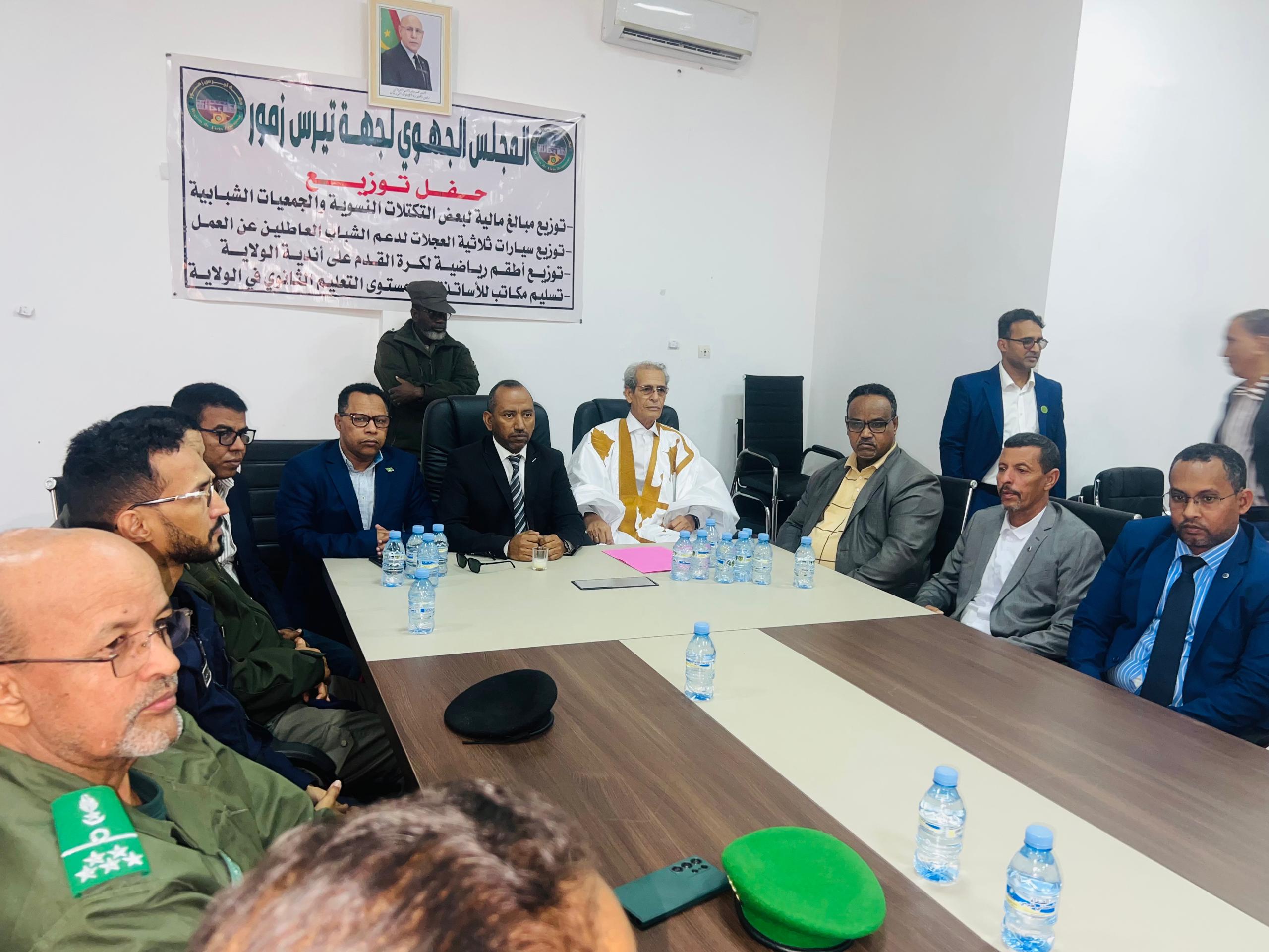 أشرف والي تيرس زمور، السيد الطيب ولد محمد محمود، زوال اليوم، بمقر المجلس الجهوي لجهة تيرس زمور، رفقة رئيس المجلس الجهوي السيد الحضرامي ولد احمادي، على حفل توزيع الدعم السنوي المقدم من طرف الجهة، دعماً للتنمية المحلية على مستوى الولاية.